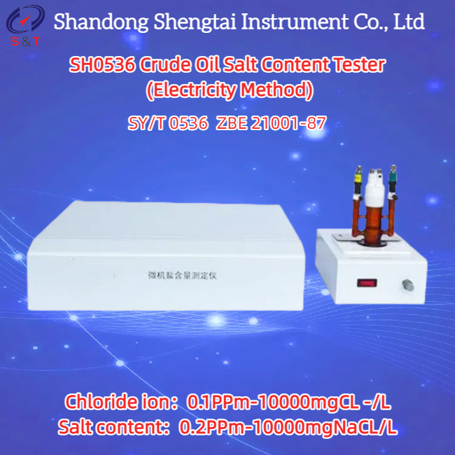 Máy đo hàm lượng muối trong dầu thô SH0536 đáp ứng các yêu cầu của các phương pháp thử nghiệm như SY/T 0536 và ZBE 21001-87. Thiết bị áp dụng phương pháp chuẩn độ vi điện lượng. Khi mẫu thử đi vào tế bào điện phân muối, Cl- trong mẫu phản ứng với Ag+ trong chất điện phân. Theo định luật Faraday, hàm lượng muối hoặc ion clorua vô cơ trong mẫu có thể thu được bằng cách tính toán lượng điện năng tiêu thụ của Ag+ được tạo ra. Thiết bị sử dụng lõi cát thay cho màng trao đổi ion để dễ dàng vệ sinh. Phạm vi ứng dụng: Thích hợp để xác định hàm lượng muối trong dầu thô, dầu cặn và các sản phẩm của chúng, đồng thời cũng có thể được sử dụng để xác định ion clorua và hàm lượng trong các loại nước công nghiệp và nước thải khác nhau.