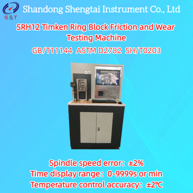 Máy thử ma sát và mài mòn vòng khối Timken SRH12, còn được gọi là máy thử Timken, đo khả năng chịu tải của các loại chất bôi trơn khác nhau (dầu bôi trơn, mỡ bôi trơn và màng bôi trơn rắn): trong các điều kiện thử nghiệm được chỉ định, lực thử nghiệm tối đa mà chất bôi trơn có thể chịu được trước khi màng dầu bị vỡ được so sánh với giá trị OK, tuân thủ tiêu chuẩn quốc gia SHT0203-1992 phương pháp đo hiệu suất áp suất cực trị cho mỡ bôi trơn (phương pháp máy thử Timken). Hiệu suất ma sát và mài mòn của mẫu được thử nghiệm bằng ma sát trượt tiếp xúc đường. Nguyên tắc hoạt động là thành phần chủ động là một vòng quay tiêu chuẩn và thành phần bị động là một khối hình chữ nhật cố định có kích thước tiêu chuẩn. Bằng cách đo chiều rộng của các vết mòn hình dải trên khối hình chữ nhật của mẫu bị động dưới các tải trọng khác nhau, cũng như lực ma sát và hệ số ma sát giữa các vật liệu cặp ma sát, khả năng chịu tải của chất bôi trơn và hiệu suất ma sát và mài mòn của vật liệu cặp ma sát được đánh giá. Nó có thể đánh giá hiệu suất bôi trơn của các loại chất bôi trơn khác nhau trong điều kiện bôi trơn ngâm dầu, đặc biệt thích hợp để mô phỏng hiệu suất chống xước của dầu bánh răng ô tô trung và cao, và có thể được sử dụng để nghiên cứu hiệu suất mài mòn của các vật liệu và lớp phủ kim loại, phi kim loại khác nhau.
