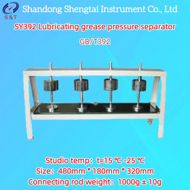 Bộ tách áp suất mỡ SY392 được thiết kế và sản xuất theo tiêu chuẩn GB/T392. Thiết bị này sử dụng bộ tách dầu có áp suất để ép dầu ra khỏi mỡ bôi trơn, sau đó đo lượng dầu được ép ra. Yêu cầu nhiệt độ môi trường xung quanh từ 15-25 ℃. Máy bốn vị trí, nhiệt độ môi trường làm việc t=15-25 ℃, trọng lượng 1000g ± 10g.