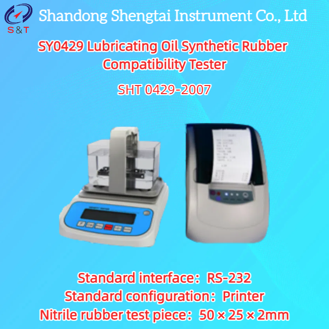 Máy kiểm tra độ tương thích của mỡ bôi trơn và cao su tổng hợp SY0429 được sử dụng để xác định độ tương thích của mỡ bôi trơn và cao su tổng hợp tiêu chuẩn, theo phương pháp xác định độ tương thích của mỡ bôi trơn và chất bôi trơn lỏng và cao su SHT 0429-2007. Một mẫu thử cao su tổng hợp tiêu chuẩn có kích thước quy định được đặt trong mẫu mỡ bôi trơn ở một nhiệt độ nhất định, và sau 70 giờ thử nghiệm, sự thay đổi thể tích và độ cứng của nó được sử dụng để đánh giá độ tương thích của mỡ bôi trơn và cao su tổng hợp tiêu chuẩn.