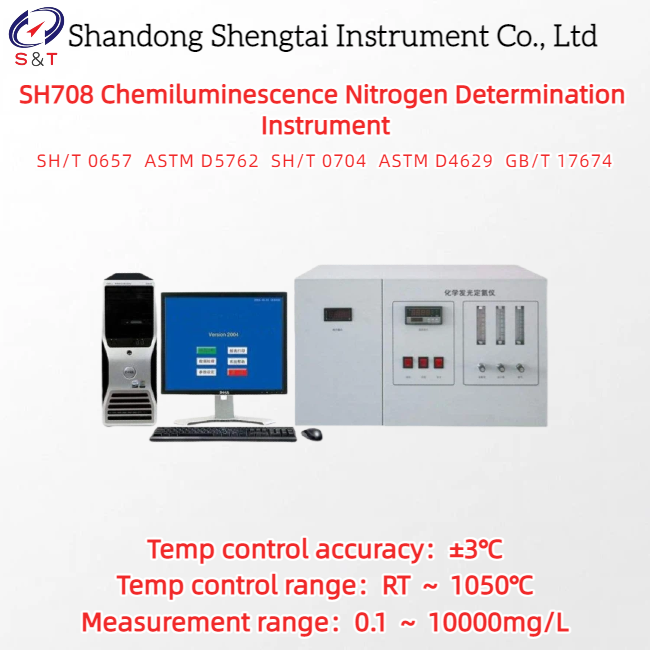 Máy phân tích nitơ hóa phát quang SH708 sử dụng phương pháp hóa phát quang để xác định hàm lượng nitơ tổng, giúp cải thiện khả năng chống nhiễu tạp chất và tránh các thao tác rườm rà của tế bào chuẩn độ do phương pháp đo điện thế gây ra và các yếu tố không ổn định, cải thiện đáng kể độ nhạy của thiết bị. Các thành phần chính của hệ thống sử dụng các thành phần nhập khẩu, đảm bảo hiệu suất đáng tin cậy của toàn bộ máy. Áp dụng để xác định hàm lượng nitơ tổng trong dầu parafin, dầu diesel, xăng, dầu bôi trơn, dầu nhiên liệu, khí hóa lỏng và khí tự nhiên, cũng như các sản phẩm dầu khác, nguyên liệu hóa học và thành phẩm, theo tiêu chuẩn SH/T 0657 Xác định vết nitơ trong hydrocacbon dầu mỏ lỏng (Phương pháp đốt oxy hóa và hóa phát quang, ASTM D5762-2017, SH/T 0704, ASTM D4629, GB/T 17674 Xác định hàm lượng nitơ trong dầu thô bằng phương pháp hóa phát quang phun thuyền).