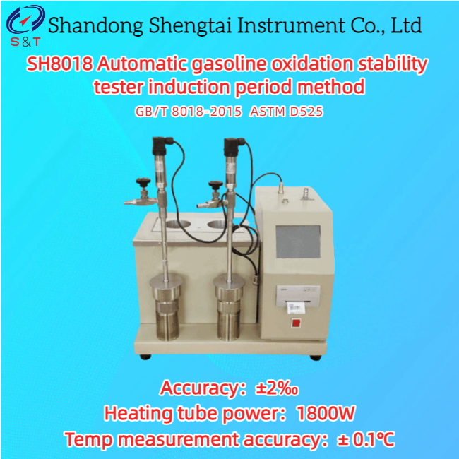Máy kiểm tra độ ổn định oxy hóa xăng tự động SH8018 được thiết kế và sản xuất theo yêu cầu của tiêu chuẩn Trung Quốc GB/T 8018-2015 "Xác định độ ổn định oxy hóa của xăng (phương pháp thời gian cảm ứng)". Thiết bị này cũng tuân thủ tiêu chuẩn ASTM D525.