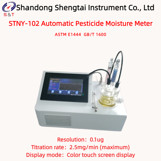 Máy phân tích độ ẩm thuốc trừ sâu tự động STNY-102 dựa trên phương pháp Karl Fischer trong GB/T 1600 "Xác định độ ẩm thuốc trừ sâu" được thiết kế và sản xuất bằng phương pháp Cullen. Thiết bị sử dụng bộ vi xử lý nhúng 32-bit làm lõi điều khiển chính, tích hợp hệ điều hành mini; Được trang bị chức năng phát hiện dòng điện không đổi và chuẩn độ cân bằng mạch đơn; Tế bào điện phân áp dụng thiết kế niêm phong chống thấm nước mới; Điều khiển tự động bằng vi máy tính, so với các sản phẩm tiên tiến tương tự trong và ngoài nước, có ưu điểm là độ nhạy cao, tốc độ điện phân nhanh, thời gian cân bằng ngắn, trừ mẫu trắng chính xác, và kết quả phân tích chính xác và đáng tin cậy.